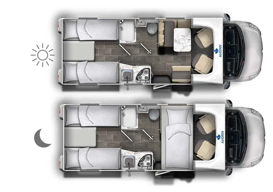 Unser Ahorn ACT 690 gehört mit seiner Gesamtlänge von 6,98 Metern zu den kompakten Einzelbett-Modellen. Diese Einzelbetten lassen sich jedoch mit nur wenigen Handgriffen und Einlegepolstern zu einer großen und gemütlichen Liegewiese erweitern. Ein weiteres Bett wird benötigt? Kein Problem - die Halbdinette mit Längsbank vorne kann blitzschnell umgebaut werden. So eignet sich der Ahorn ACT 690 für bis zu 4 Personen.